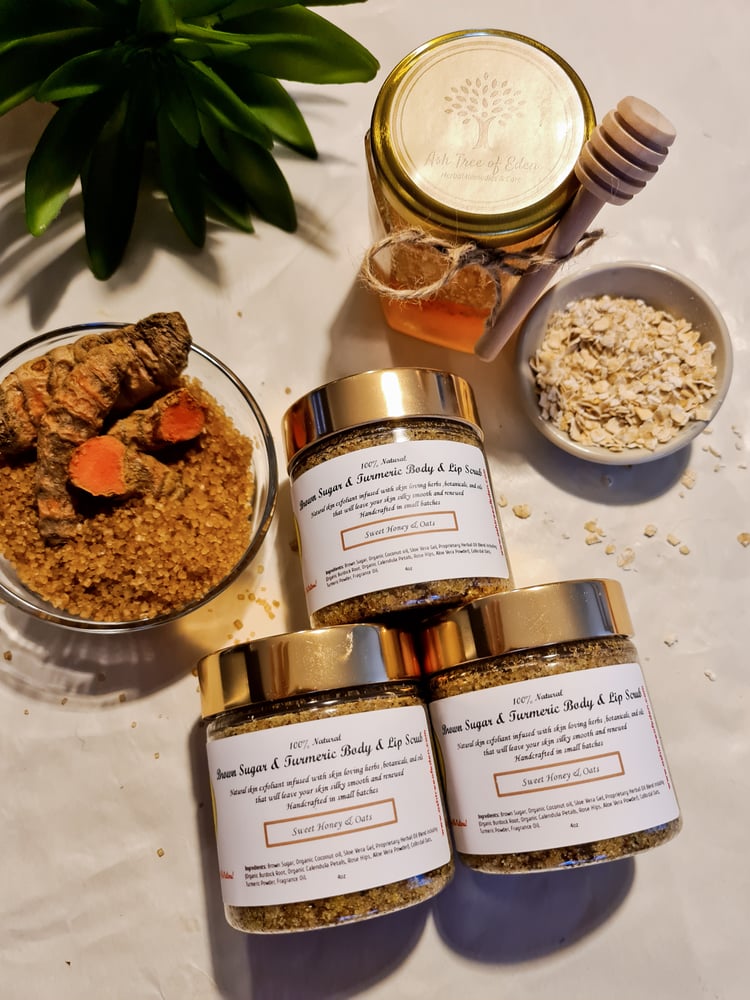 Natural body exfoliant made of brown sugar, turmeric to brighten, honey to moisturize and aloe & oats to soothe the skin. Can be used on body and lips to remove rough dead skin cells so that skin is fresh and renewed! 4oz container.